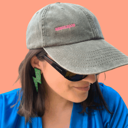 É verde tropa, ajustável, e podes escolher entre letras em rosa ou laranja.