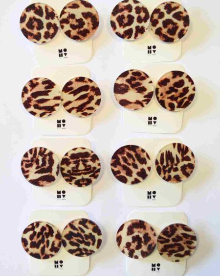 Brincos em animal print, inspirados na Scary Spice. São todos diferentes, selvagens e rebeldes. Irreverentes, cada um tem o seu próprio padrão, o rebuliço não se copia.