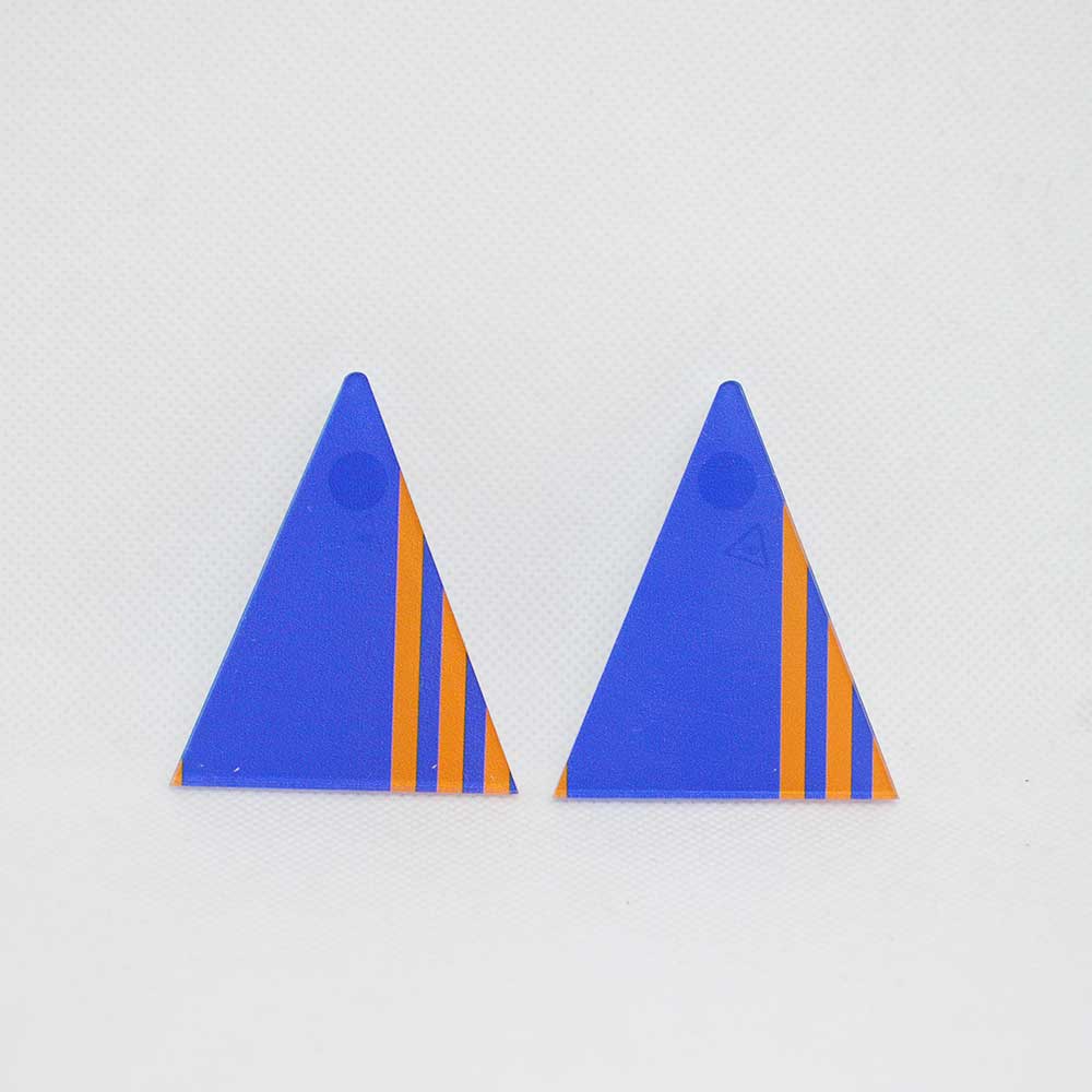 Brincos com riscas laranja em fundo azul, inspirados na Sporty Spice.